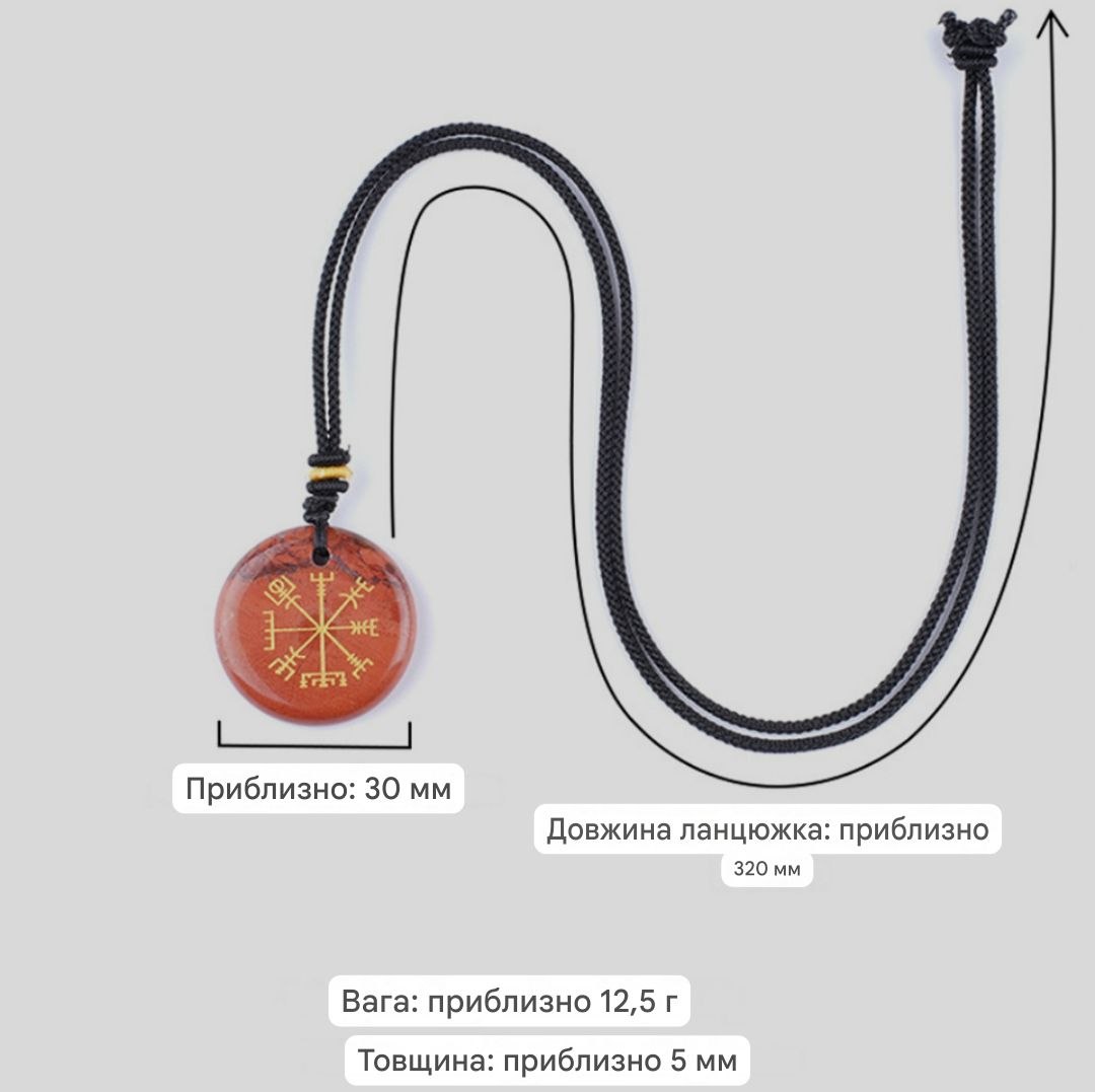 Медальйон рунічний компас Вегвізир з натурального каменю — прикраса зі скандинавським символом навігації вікінгів. Кулон Вегвізир поєднує давню рунічну символіку та природну красу каменю. Доступні варіанти: індійський агат, тигрове око, аметист, авантюрин, яшма, обсидіан, кварц і унакит. Медальйон підходить для щоденного носіння, гармонійно доповнює стиль та стане символічним подарунком для прихильників скандинавської культури. Максимальна довжина (регулюється) шнура: 60 см. Тип шнура: текстильний.