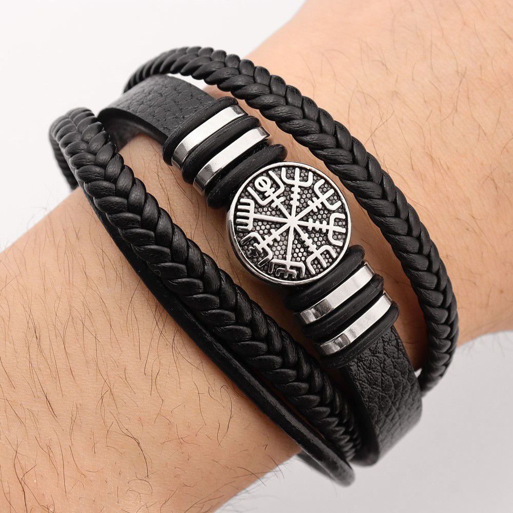 Браслет «Вегвізир» з екокожі та цинкового сплаву — стильний скандинавський оберіг, який символізує захист і напрямок у житті. Зручний магнітний замок забезпечує легке носіння, а багатошаровий дизайн робить браслет унікальним аксесуаром для щоденного образу. Розмір браслету – 21,5 см.
