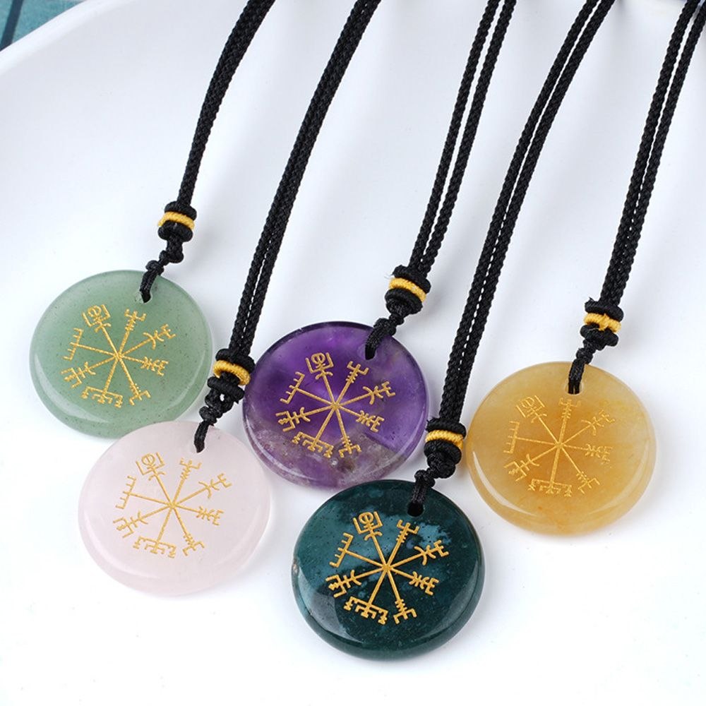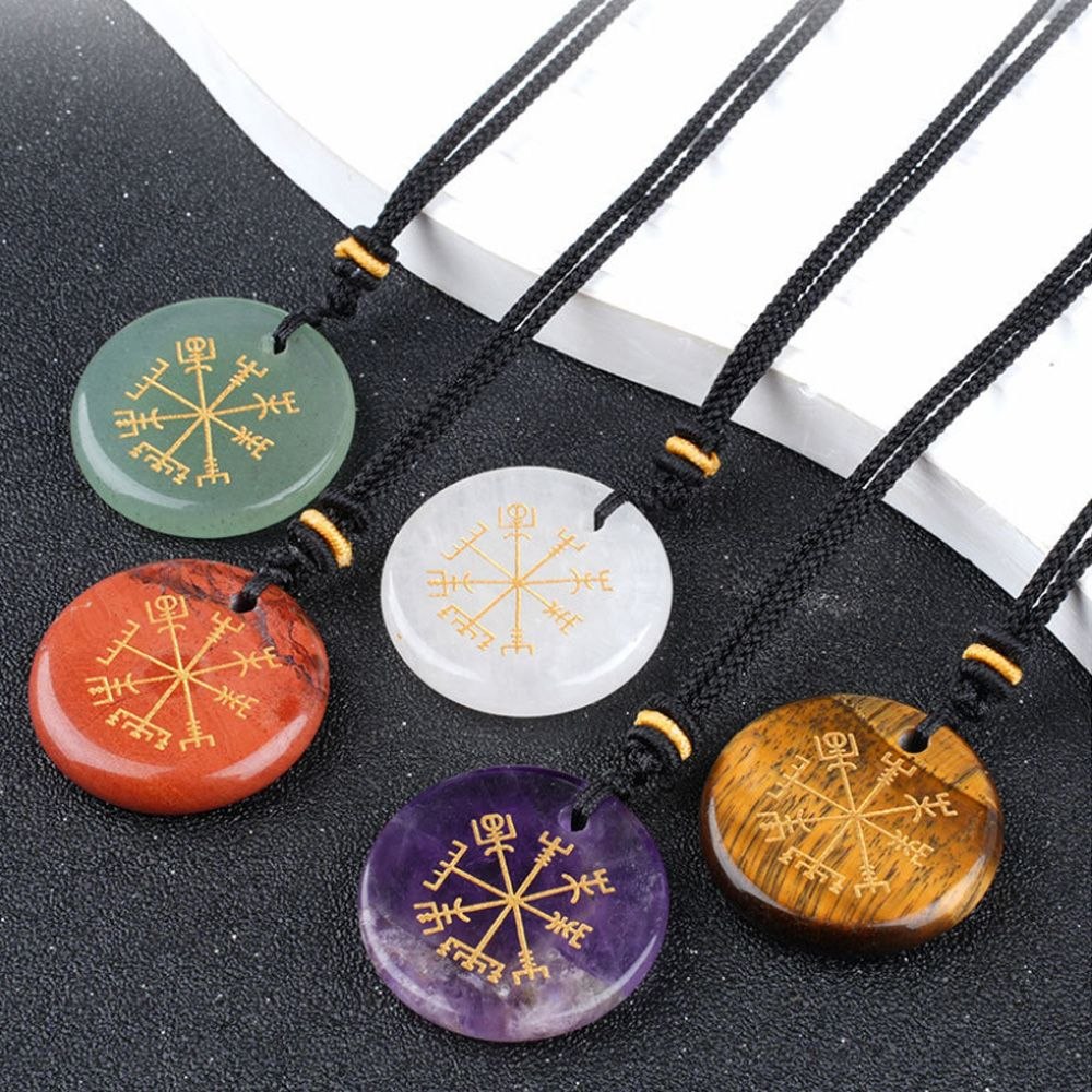 Медальон рунический компас Вегвизир из натурального камня – украшение со скандинавским символом навигации викингов. Кулон Вегвизир сочетает давнюю руническую символику и природную красоту камня. Доступны варианты: индийский агат, тигровый глаз, аметист, голубой/зеленый авантюрин, яшма, обсидиан, белый кварц и унакит. Медальон подходит для повседневной носки, гармонично дополняет стиль и станет символическим подарком для поклонников скандинавской культуры. Максимальная длина (регулируется) шнура: 60 см. Тип шнура: текстильный.