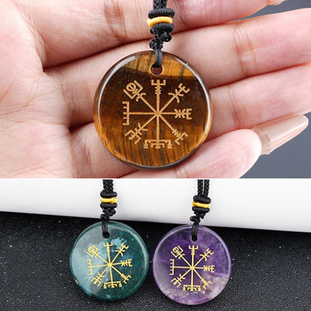 Медальон рунический компас Вегвизир – украшение со скандинавской символикой, сочетающее древний знак навигации викингов и натуральный камень. Символ вегвизира известен как «рунический компас викингов». В скандинавских сагах знак помогал путешественникам находить верный путь в море, во время бури и тумана.